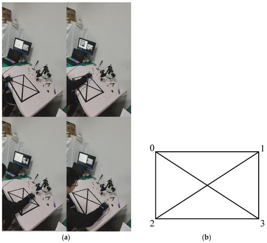 In this section, the positioning accuracy of the system built in the experimental environment is verified to ensure its effectiveness in practical use. The experimental process is shown in Figure 10a, the experimenter wears the glove device and controls their hand to move slowly along the trajectories. Since visually impaired individuals will mainly use the system for operations on a desk, a two-dimensional pattern is marked on the coordinate paper on the desk, as shown in Figure 10b. The pattern is rectangular, with a size of 0.30 m × 0.45 m and four endpoints connected through various paths.