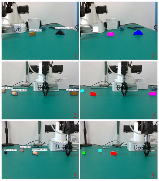 To verify the target detection performance of the deployed model in the experimental environment, the model was tested on randomly collected images. The detection results include the predicted category, confidence, and position information of the target objects, where different objects are distinguished by different colored detection boxes. Figure 9a shows the original detection image, and Figure 9b shows the detection results. The confidence of detecting the Dobot robotic manipulator is 0.96, the cuboid is 0.97, the cylinder is 0.95, the cube is 0.97, the triangular prim is 0.98, and the sphere is 0.98. It can effectively reveal the target objects’ categories, positions, and confidences.