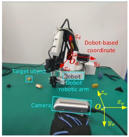 The client receives the global coordinates of the cube, Dobot manipulator, and camera in the semantic map from the map server, denoted as , , and , respectively. They need to be transformed into the Dobot-based coordinate system for grasping. The transformation relationship is given by the following equation: