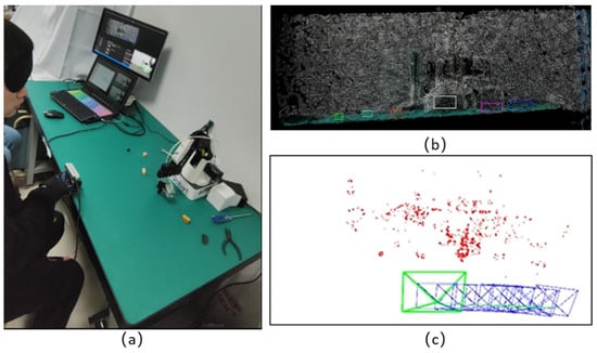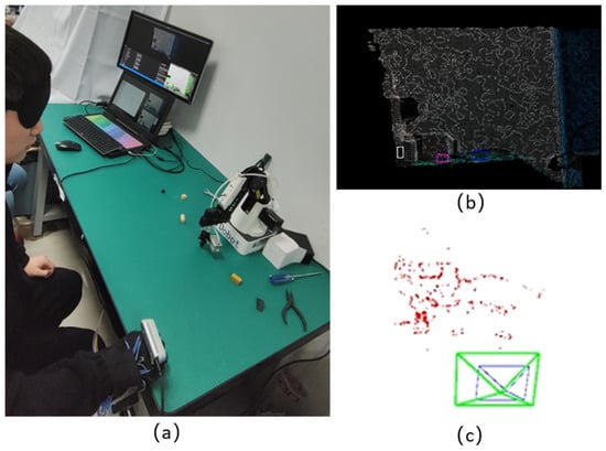 The system started running from the SLAM mode to generate the map, and the experimenter moved his hand along the edge of the table from right to left while the camera scanned the table. In Figure 16 and Figure 17, (a) shows the process of the visually impaired person’s operation, and (b) and (c) show the semantic map and sparse map generated during the process, respectively. The semantic map marked the size and position of the target object using rectangular boxes in different colors. The sparse map contains 3D map points corresponding to the 2D sparse feature points in the scene and the motion trajectory of the visually impaired person’s hand, where blue and green markings represent the historical and current poses during the movement process. Black map points indicate historical map points the camera cannot observe currently, while red map points indicate the current local map points the camera can observe. When the hand moved to the workspace boundary on the table, the SLAM mode stopped, and the map was saved. The entire mapping process took about 30 s.