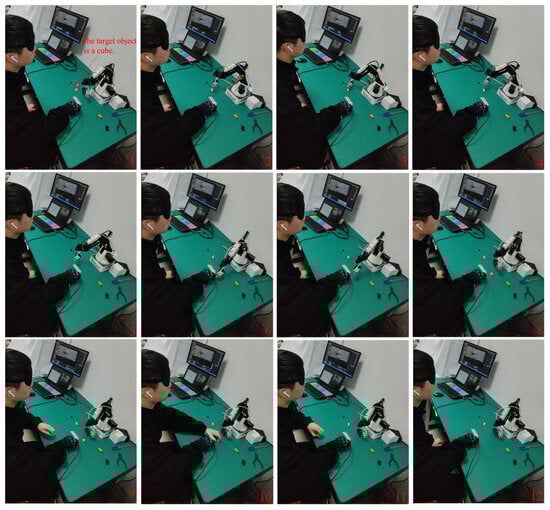 The robotic manipulator can be used to assist the visually impaired person in retrieving the cube with assisted grasping mode. Firstly, the system recognizes the voice command “grab the cube” from the experimenter, and then it searches for the target object in the generated semantic map. The center of the cube, the Dobot robotic manipulator, and the camera worn on the hand are located, and their global map coordinate information is returned to the client. The process of assisted grabbing is shown in Figure 18, where the Dobot robotic manipulator moves above the cube, performs the grasping, and then places it just in front of the hand for the visually impaired person to obtain. The assisted grasping process with a robotic manipulator takes almost 37 s.