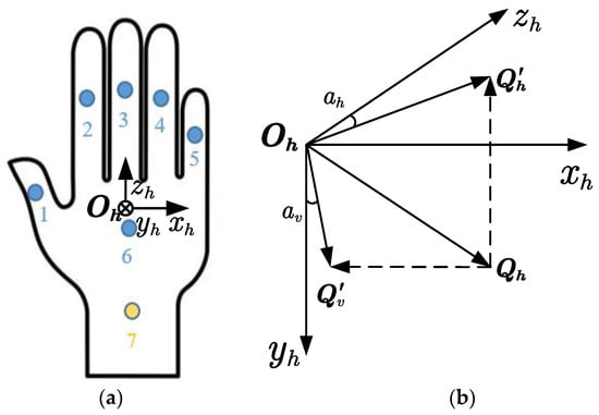 Vibration array design and azimuth calculation. (a) The installation positions of the vibration array on the glove. (b) Coordinate for the calculation of and .