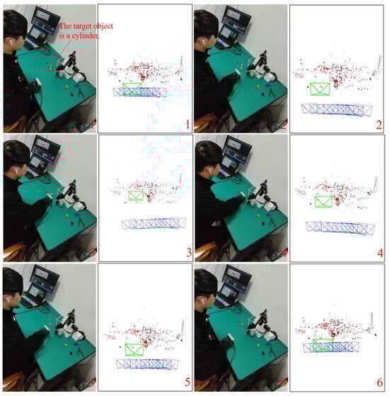 The tactile interaction module calculates the horizontal azimuth degree, vertical azimuth degree, and distance cm of the target object relative to the hand based on this coordinate, which means the target object is in a slightly lower left direction, far from the hand. The experimenter can feel strong vibrations from the second, third, and sixth motors. Based on this vibration information, the experimenter can quickly determine the target’s location and successfully grasp it. Figure 20 shows the sequence of actively grasping the cylinder target and the real-time pose display of the hand-worn camera. The active grasping process takes almost 24 s.