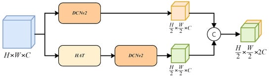 Objects in remote sensing images may be relatively small. It is challenging for YOLO to detect samll targets because of the lack of specific information. To address these challenges, we designed a module called the Detection Refinement module (DRmodule), which is placed in the Backbone of the YOLO module to further enhance detection performance. The DRmodule enhances multi-scale expressive abilities and improves performance in low-resolution settings for detecting small targets in remote sensing images by integrating DCNv2 [36,37] and the Hybrid Attention Transformer [38]. As shown in Figure 2, the DRmodule uses DCNv2 to derive geometric features from the input features. Then, a Hybrid Attention Transformer (HAT) is applied for feature extraction before using DCNv2 again to extract deeper features. These two sets of features are concatenated together. By fusing features across scales and adapting to deformations, the DRmodule enhances the effectiveness of the model in handling complicated situations in the images of remote sensing, thus improving the precision and reliability of target detection.