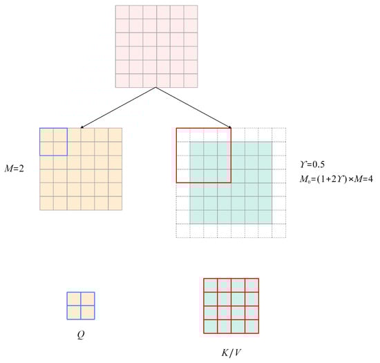 As shown in Figure 5, the specific computation procedure resembles that of the W-SMA module [40], but in calculating the attention mechanism, zero-padding is applied to the original image during the computation of , allowing for learning from the content in another window through a larger window. When a feature map is input into this layer, it is divided into several windows, which serve as the in the attention mechanism. At the same time, the original feature map undergoes zero-padding controlled by the parameter . The padded feature map is divided into feature maps, which serve as the . The attention algorithm is as shown in Equation (3). The design of this module enables better utilization of the pixel information within a window for queries, thereby improving the model’s performance.