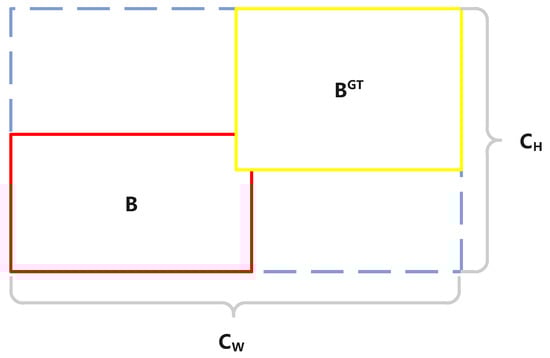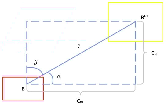 Here, denotes the Euclidean distance of two points. and indicate the minimum bounding rectangle’s width and height for the predicted and real bounding boxes. b and represent the centers of the two boxes, while and stand the width and height of the predicted and real boxes.