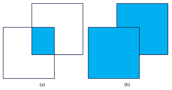 In OIoU, we use IoU to describe the difference between predicted and real detection boxes. Figure 10a shows the intersection between the detection boxes, and Figure 10b shows their union. We use A to represent the predicted detection box, and B to represent the real detection box. The calculation equation for IoU is shown in Equation (13).