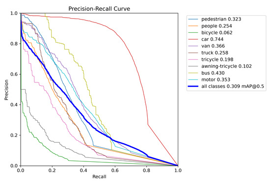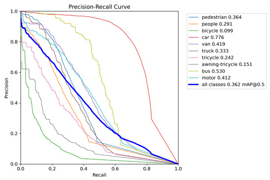 This paper mainly uses mAP50 and mAP75 as the key indicators, and their calculation process is as follows. First, we need to calculate the average precision (AP). In mAP50, we consider a detection correct if the IoU between the predicted box and the ground truth box is greater than 50%. In mAP75, we consider a detection correct if the IoU is greater than 75%. After calculating the AP for each category, we take the average of the AP values for all categories to obtain the final mAP. The specific computational equation is as shown in Equation (15).