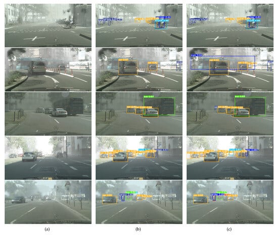The detecting result comparison in Foggy Cityscapes dataset between YOLOv8n and OD-YOLO. (a) Original images; (b) The result of YOLOv8n; (c) The result of OD-YOLO.