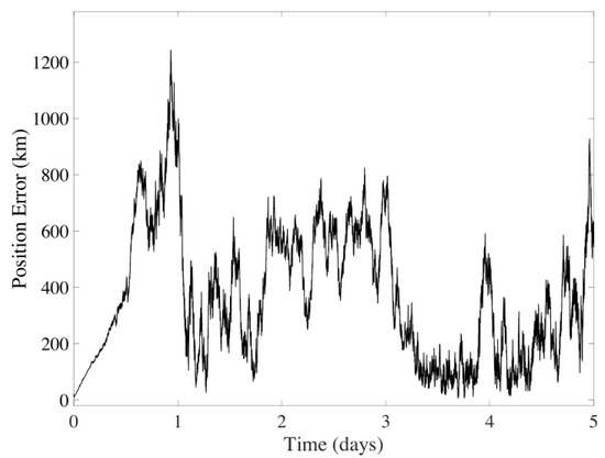The second approach utilizes only CMB sensors and follows the measurement model (Equation (20)), capitalizing on the isotropic characteristics of CMB radiation. This facilitates sensor orientation that is aligned with mission goals without limiting orbit selection. It achieves notable accuracy in velocity estimation, with a mean error of m/s and a standard deviation of m/s. However, its disadvantage lies in the position estimation, leading to a significant accumulated error that extrapolates filter capacity, as indicated by a divergence behavior.