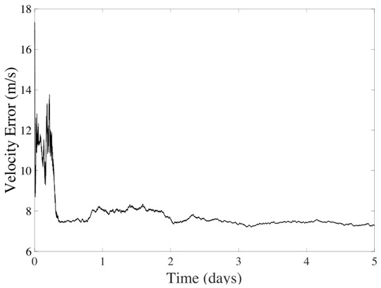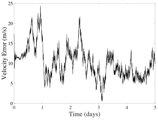 As shown in Figure 8 and Figure 9, there is a noticeable decrease in velocity error over five days while the positional data diverges. It is observed that the average error for the position is km, and for velocity, it is m/s.