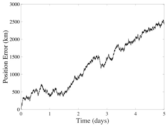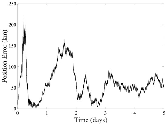 Position error in the UKF considering CMB-aided CeleNav over five days of navigation between Earth and Mars.