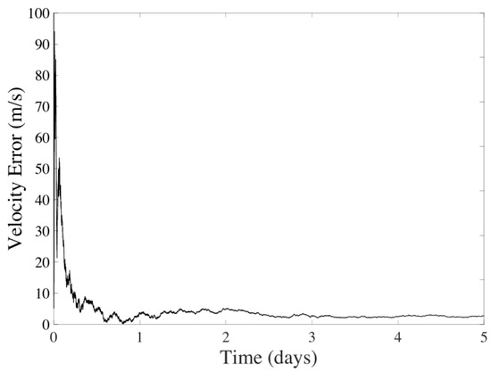 Velocity error in the UKF considering CMB-aided CeleNav over five days of navigation between Earth and Mars.