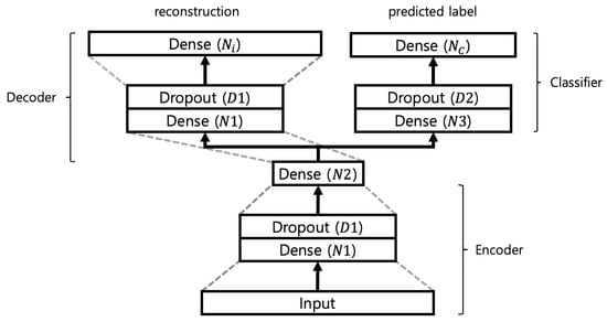 The proposed model has seven hyperparameters: the number of neurons in each layer , dropout ratio , weighting factor , and learning rate . Autoencoders are generally structured such that the number of neurons decreases as the encoder passes through each layer, and the number of neurons increases as the decoder passes through each layer. Considering this, the search space of is from 64 to 256, and that of is 8 to 64. The range of is the same as that of . The values of and ranged from 0 to 0.3, ranged from 0.1 to 0.9, and ranged from 0.01 to 0.0001 on a logarithmic scale.