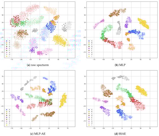 Visualization of two-dimensional reduced (a) raw spectrum and latent vectors generated by (b) MLP, (c) MLP-AE, and (d) the SSAE on the test dataset through t-SNE.