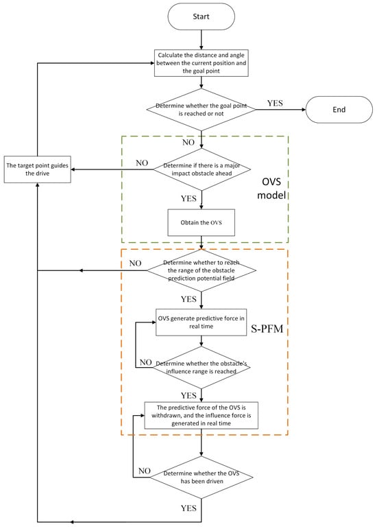 The S-APFM algorithm flow is shown in Figure 1. First, the main influencing obstacles in front of the AMR were identified based on calculations. Then, the optimal virtual subgoals (OVS) were obtained using the optimal virtual subgoal model. Finally, when the AMR reached the range of the subregion potential field of the main influencing obstacle, the S-PFM was utilized to smoothly navigate around the obstacle and reach the goal point. The S-APFM algorithm involves two key technical points: constructing the optimal virtual subgoal model and building the S-PFM.