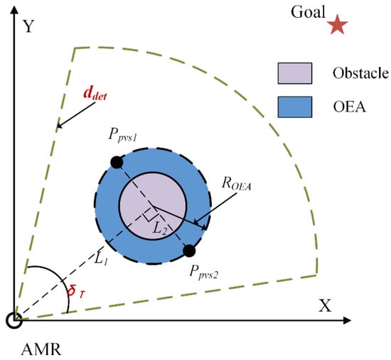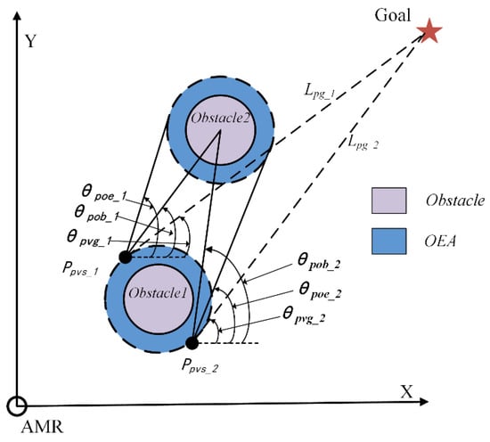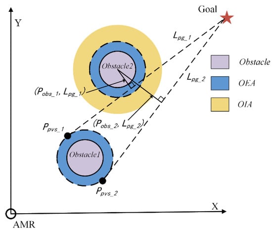Considers the presence of obstacles between the APO and the goal point, as shown in Figure 3. An Obstacle Influence Area (OIA) is introduced outside the OEA due to the presence of obstacles [33], with a radius of ROIA. The numerical range of ROIA is 1.85 Robs to 2.85 Robs. The value of ROIA affects the size of the obstacle avoidance range of the AMR. Lpg represents the line connecting the PVS and the goal point, and (Pobs, Lpg) represents the distance from the obstacle to Lpg.