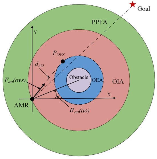 To reduce the angle changes and obtain a smoother path for the AMR during obstacle avoidance, this study introduced the Predicted Potential Field [36], virtual subgoal influence force, and angle constraints to form a Subarea-Potential Field Model (S-PFM) [30,36,37]. At the same time, a series of circular regions were set around the obstacles, as shown in Figure 6. Starting from the innermost region and moving outward, these circular regions were the Obstacle Expansion Area (OEA), the Obstacle Influence Area (OIA), and the Predicted Potential Field Area (PPFA) [28,33,38]. The Predicted Potential Field exerted its influence in the PPFA circular region, enabling the anticipation and control of the AMR’s avoidance angle. The influencing force of the virtual subgoal was applied within the OIA circular region.
