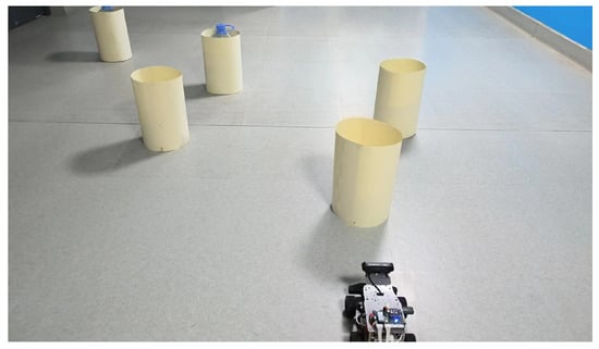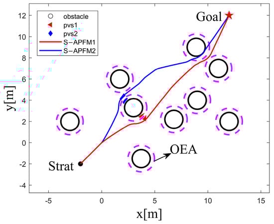 In the case of selecting OVS in the PVS, the coordinates of the starting point and goal point of the AMR were set as (−2, −2) and (12, 12), respectively. The coordinates of the main obstacles were (3, 3.3), as shown in Figure 8.