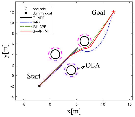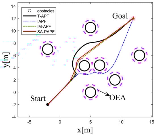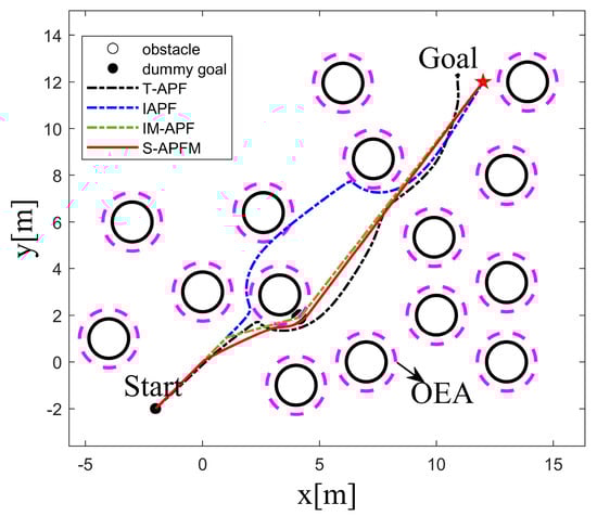 For the scenario of local minima, the starting point of the AMR was set at (2, 2) and the goal point coordinates were (12, 12). The coordinates of the obstacle were (6.5, 6.5), as shown in Figure 9. When the AMR moved towards the obstacle using the T-APF algorithm, it got stuck in front of the obstacle. In the other algorithms, due to the presence of virtual subgoals, the AMR was able to escape from the local minima and reach the goal point when it became trapped in a local minimum situation.