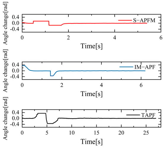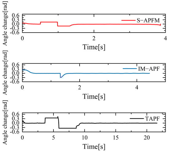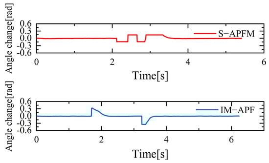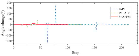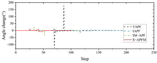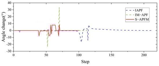 Comparing the angle changes of different algorithms, as shown in Figure 10, the heading angle variances for IM-APF algorithms was 14.87, respectively, while the heading angle variance for the S-APFM algorithm was 8.15.