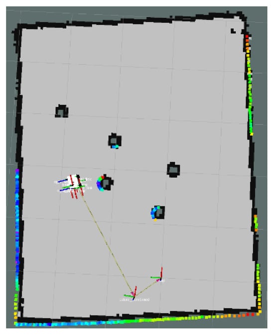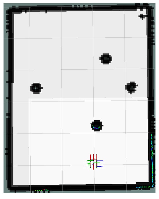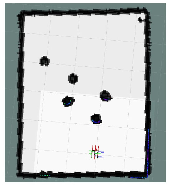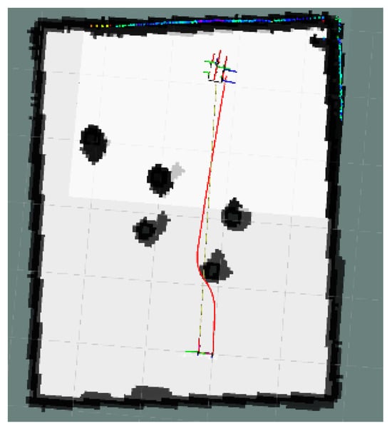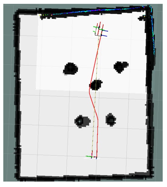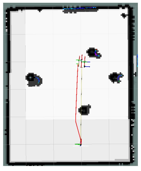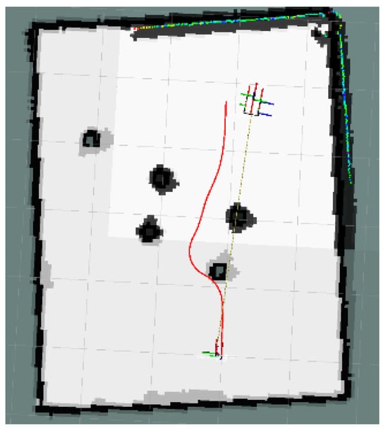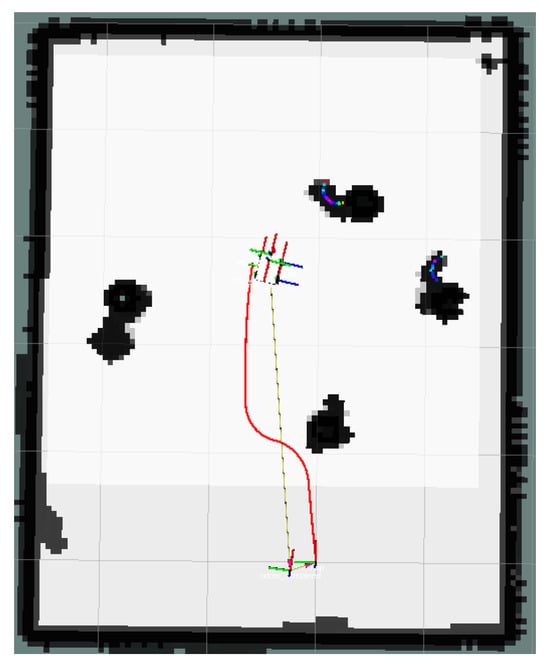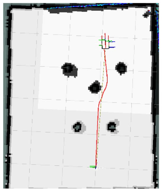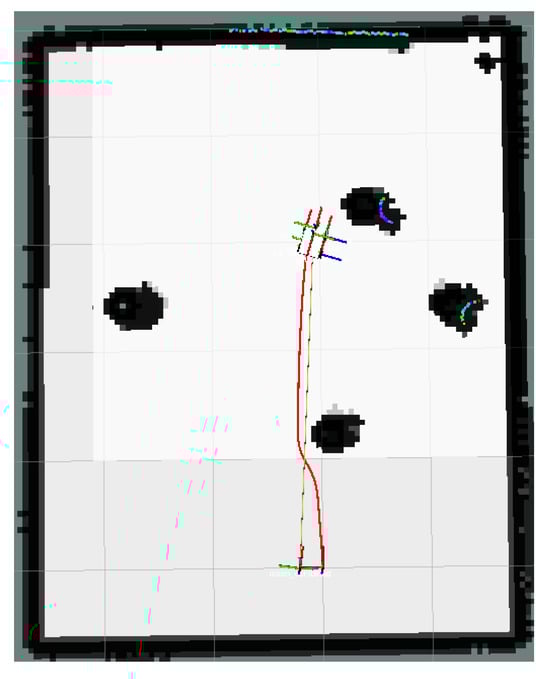 This section focuses on the physical experiments conducted for the simulated simulation in Section 3.2.3 of this paper. The experimental map is shown in Figure 29. The local path planning path under the S-APFM algorithm is illustrated in Figure 30, while the global path planning paths under the IM-APF algorithm and TAPF algorithm are shown in Figure 31 and Figure 32. When employing the S-APFM algorithm for local path planning in complex environments, it was still able to select an optimal velocity profile to reach the goal point, resulting in a smoother path compared to the paths produced by the IM-APF and TAPF algorithms for obstacle avoidance. Under global path planning, the IM-APF algorithm was capable of reaching the goal point, but the TAPF algorithm generated excessively large turning angles due to the repulsive forces caused by obstacles and also failed to reach the goal point, as the gravitational force gradually diminished as the AMR approached the goal.