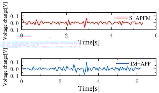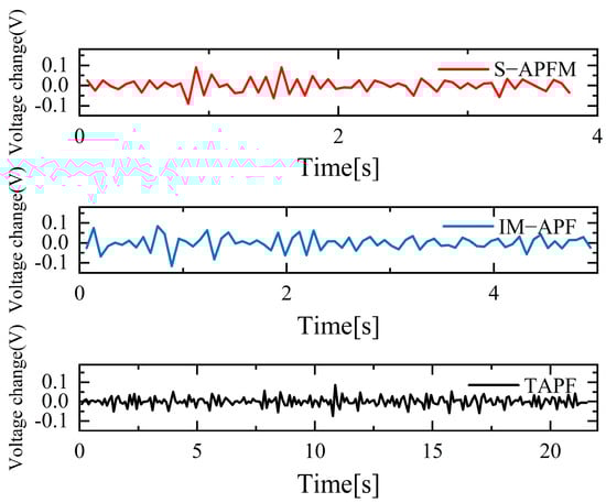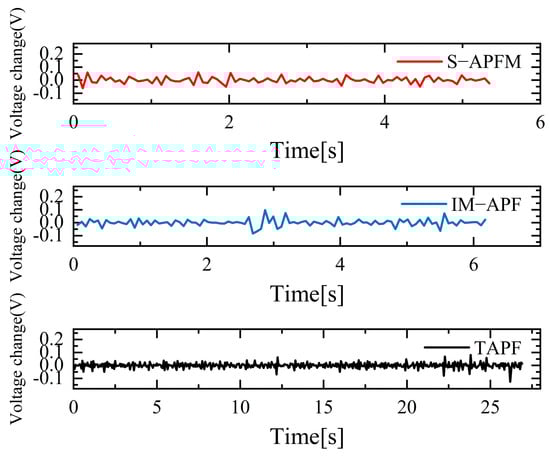 The statistics on battery voltage changes during traveling are shown in Figure 34. When the S-APFM algorithm was driving, due to the reduction in the angle of mutation, the AMR battery voltage was changed compared to the IM-APF algorithm, and compared to the TAPF algorithm, the transformation amplitude was decreased. For the S-APFM algorithm, IM-APF algorithm, and TAPF algorithm, the square sum of the battery voltage change was 0.054, 0.061, 0.179, respectively, indicating that the S-APFM algorithm maintained low power energy consumption when facing complex environments.