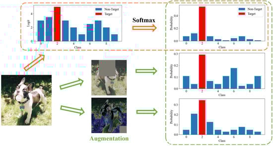 Motivation. Orange dashed box: the exponential nature of softmax results in overlooking the effect of non-target classes. Green dashed box: viewing the same sample from different perspectives provides diverse insights into category relevance.