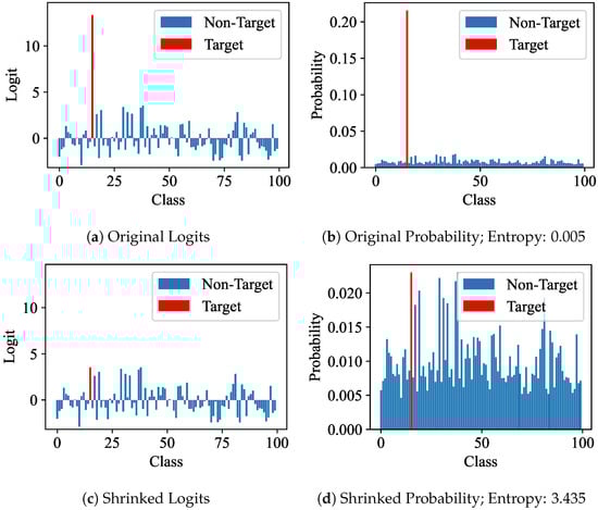 Comparison between logits and probabilities before and after magnitude enhancement.