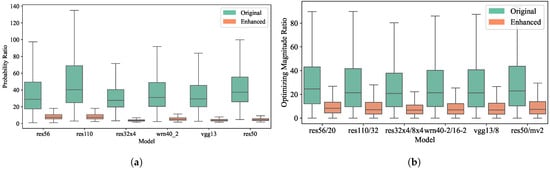 Comparison of probability ratio and optimizing magnitude ratio before and after magnitude enhancement. (a) : ratio of the probability of the target class to that of the non-target classes; (b) : ratio of the optimizing magnitude of the target class to that of the non-target classes.