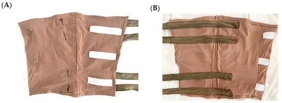 For the external material of the anklet, we selected an elastic fabric. Three Velcro strips along the anklet were used in order to close it and adjust it to the leg, ensuring that the strips of conductive material were well attached to the skin before making good contact with it. A user-centric design was followed. The comfort level of the patient after initial tests and previous prototypes in volunteers was taken into account to implement the final electrodes. The inner and outer surfaces of our anklet can be seen in Figure 2A,B.