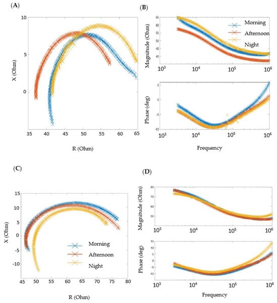 Bioimpedance data for a healthy individual at different times over one day (morning, afternoon, and night). (A) Cole–Cole diagram. (B) Bode diagram. (C,D) The bioimpedance data for the healthy individual on a different day.