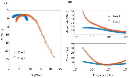 Figure 3 shows the typical bioimpedance data for a healthy person at different times of the day (Cole–Cole diagram in Figure 3A and Bode diagram in Figure 3B). We observed similar values of the monitored bioimpedance during these different times (morning, afternoon, and night), showing the good repeatability and robustness of data. Another interesting result obtained was the successful comfort level of the wearable device for volunteers, even though the wearable device was not worn for a long period of time.