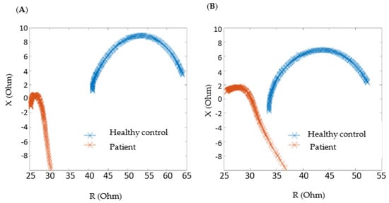 Bioimpedance data for healthy controls versus patients at different times of the day. (A) Morning; (B) afternoon.