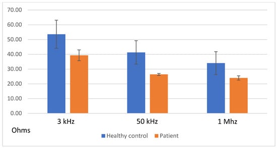 Figure 6 illustrates the mean value of the impedance magnitude at selected frequencies as follows: 3 kHz, 50 kHz, and 1 Mhz. Data are presented for all healthy controls and patients, together with the dispersion of measurements. Together, 3 kHz and 50 kHz correspond to the lower and higher frequencies used in the SFB7 device, respectively. The value of 50 kHz corresponds to an intermediate frequency commonly used in bioimpedance measurements [,].