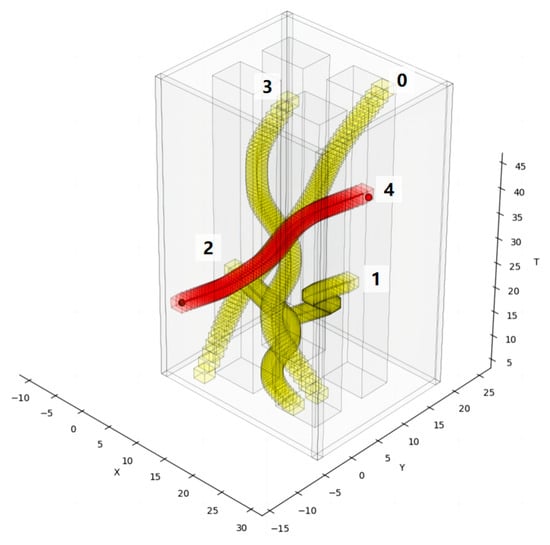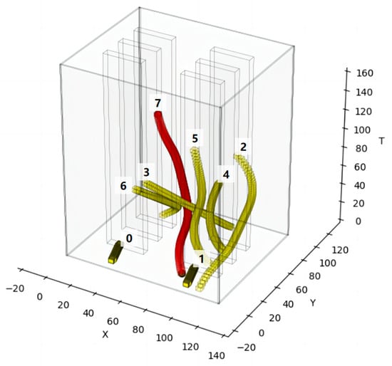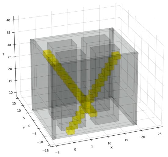 The X-Y-T spatiotemporal grid map is shown in Figure 2. To ensure that multiple robots do not collide, the obstacle information needs to be represented in a 3D spatiotemporal grid map, where the spatiotemporal trajectory of the existing robots is represented as dynamic obstacles visually identifiable in the grid map as regions of XY positional states at various discrete time points []. The spatiotemporal trajectory of the existing robots is constructed as described in Section 2.4. Dynamic obstacles, depicted in yellow in the figure, are known and predictable, while static obstacles, shown in gray, are represented as XY regions parallel along the time axis T. Using 3D spatiotemporal grid maps to represent obstacles can clearly represent the positional relationship and relative motion of different robots and obstacles during the time period.