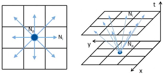 The search process of the algorithm requires spatiotemporal node expansion. The node state space of the traditional A* algorithm is (x, y) []. The X-Y-T three-dimensional spatiotemporal grid map used in this study increases the time dimension information and the corresponding velocity information, so the corresponding spatiotemporal variable-step-size A* algorithm state space is (x, y, t); the first two items are the same as the node state space of the traditional A* algorithm, and the third item is the time node where the current position is located. The spatiotemporal node expansion approach is shown in Figure 5.