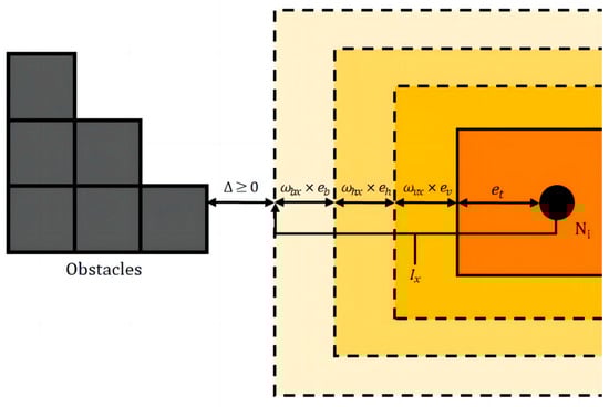 where , are the x and y coordinates of the obstacle risk source center; are the distribution factors of obstacles in the x and y directions, respectively.
