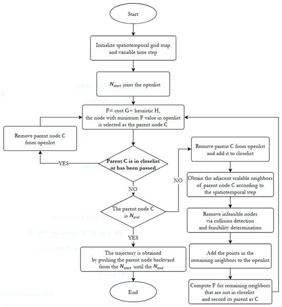 In this work, the spatiotemporal 3D A* algorithm was selected for improvement. The A* algorithm is a commonly used search algorithm based on the principle of heuristic search, which means that instead of blindly exploring every possible path, the search is guided by some heuristic information, thus finding the best path more efficiently. The flow of the A* algorithm is described in detail in Section 3.3.