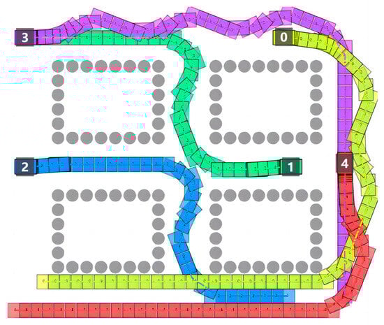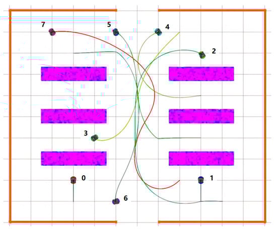 For comparison, simulation experiments were conducted using the Efficient Trajectory Planning for Multiple Non-holonomic Mobile Robots (ETPMR) from Li J’s research []. This method utilizes spatiotemporal joint planning and a graph-based multi-agent path planner. The results, shown in Figure 16, were standardized to a uniform speed of 1 m/s for all robots. The method does not use a spatiotemporal grid map to display the results, so the planar graph output by its original program is used in Figure 16.