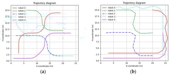 Table 6 provides a comparison of the distance traveled by each robot under the two methods. As observed in the first experiment, trajectories are shorter after spatiotemporal trajectory instantiation optimization. Furthermore, compared to the ETPMR, trajectories generated by the STP-STVS-A* are shorter and closer to the shortest driving path. This is attributed to the STP-STVS-A*’s utilization of a trajectory search approach with variable time steps, enabling each robot to operate at different target speeds—a feature that enhances practicality in certain scenarios.
