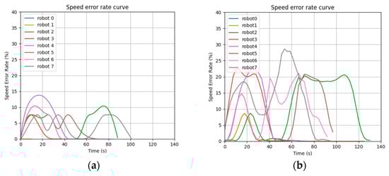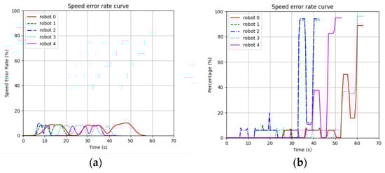 The representation is the same as that of the first simulation experiment. Figure 18 shows the curve of the speed error rate for each robot in the results of the STP-STVS-A* and the ETPMR. Figure 19 shows the distribution of the speed error rate for each robot in the results of the STP-STVS-A* and the ETPMR.