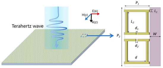 Since the double-chain structure is convenient for easily constructing two symmetric or asymmetric cavities with one cavity on one chain, which are necessary for generating the BIC or QBIC mode, the designed metamaterial sensor is comprised of a dual-chain separated resonant cavity structure and is shown in Figure 1. Its unit structure with two separated resonant cavities is pointed out by the blue arrow in Figure 1 with structural sizes of P1 = 40 μm, P2 = 80 μm, l1 = 3 μm, l2 = 28 μm, d = 30 μm, and d1 = 2 μm and the thickness of 200 nm. The substrate of the metamaterial sensor is high-purity quartz with a thickness of W = 500 μm. Symmetry-protected excitation of QBIC is broken by varying the magnitude of d2.