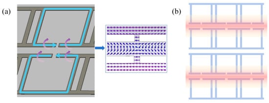All of the simulations in this work are performed with the CST Studio Suite 2022. The materials used for the structure are selected from the CST material library (SiO2, Au, and PEC). The periodic conditions are implemented in the x- and y- directions and the z-direction is set to open by adding a vacuum space. As shown in Figure 2a, under the excitation of the vertically incident THz wave, the upper and lower resonance cavities generate a pair of reverse currents (blue arrows), which produce a circular magnetic field (violet arrows). The electric field distribution at the openings is demonstrated in the dashed box of Figure 2a. The magnetic field generated by the upper and lower loops is coupled in the resonance cavities and their gap region, thus exhibiting a binding force on the photons and resulting in confinement of the light field in a large area around the loops, and the resonance cavities as shown in Figure 2b, which may ensure the sensor can capture more sample molecules on the surface and realize the trace detection of samples.