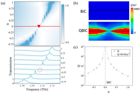 where is the transmission intensity, a1, a2 are constant real numbers, and are the resonant frequency and damping rate, respectively, and the Q factor of the Fano resonance is calculated under different α according to Q = /2. Variation in the Q factor with |α| is obtained as shown in Figure 3c. It can be seen that the closer |α| is to 0, the larger the Q factor is. Furthermore, the Q factors are approximately the same at the same |α|. Previous studies had confirmed that the relation between the Q factor and α is inversely quadratic [37,38] with Q = Q1|α|−2, where Q1 is an independent constant and depends on the topology and material properties of the metamaterial itself. Here, the Q factor is fitted with the equation of Q = 98.96|α|−2 with R2 > 0.999. This is in accordance with the Q factor variation rule for the excitation of the symmetry-protected BIC mode, proving that the QBIC mode is excited by symmetry-breaking.