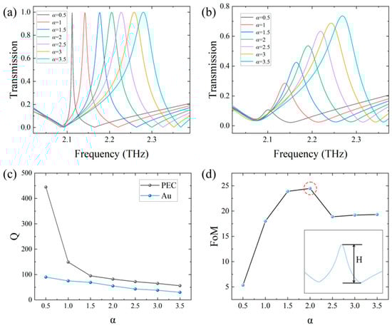 (a) Resonant peak variation with α using the PEC material; (b) Resonance peak variation with α using the gold metal material; (c) Variation in Q factor with α for different materials; (d) Variation in FoM with α and the definition of H in the inset.
