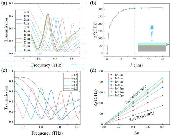To characterize the sensing performances of the metamaterial sensor, transmission spectra under different thicknesses and refractive indices of the detected sample are simulated and shown in Figure 5a,c. It can be seen that in comparison with the resonant frequency of the blank sensor, the resonant frequencies of the sensor covered by the sample with different thicknesses and refractive indices have different redshifts. The reason is due to the fact that the increased thickness and refractive index of the detected sample will increase the equivalent capacitance of the sensor, which will result in the decrease in the resonant frequency according to the LC circuit principle. To quantitatively illustrate the effects of the thickness and the refractive index of the detected sample on the transmission property of the sensor, the relations between the resonant frequency shift Δf and the thickness h are shown in Figure 5b. From this figure, we can see that Δf first nonlinearly increases with the increase in h and then saturates at 20 μm. This is due to the fact that as the thickness of the covered sample increases to exceed 20 μm, the upper part of the sample exceeding the edge of the bound optical field cannot interact with the confined electromagnetic wave, and therefore the thickness sensitivity disappears. From Figure 5d, we can see that the resonant frequency shift Δf increases linearly with the increase in Δn at different sample thicknesses, where Δn is the refractive index change relative to the air of n = 1.0. By defining the sensitivity of the sensor as S = Δf/Δn, it can be seen that the maximal S is calculated to be 544 GHz/RIU at the saturated covering thickness of 20 μm. Even at the smallest simulation thickness of h = 1 μm, S1 = 220 GHz/RIU as shown in Figure 5d, indicating that the sensor also has good sensing performance for ultra-thin object detection.