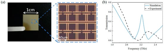 According to the above simulation results, the metamaterial sensor with optimal parameters was fabricated using a combination of photolithography and vapor deposition processes. In order to bond the metal layer and the substrate more tightly, 10 nm thick chromium is added between the 200 nm gold metal layer and the 500 μm quartz substrate as an adhesive. One of the fabricated metamaterial sensors is shown in Figure 6a. The THz transmission spectrum of the fabricated sensor is displayed in Figure 6b. For comparison, the simulation transmission spectrum of the blank sensor is also shown. It can be seen that the resonant peak of the fabricated sensor has a blueshift of about 80 GHz and its depth is smaller compared to the simulated resonant peak, which may be due to the fact that the actual ohmic loss of the metal is higher than the simulated one and the quality of the experimental resonant peak degrades because of the impact of the processing accuracy.