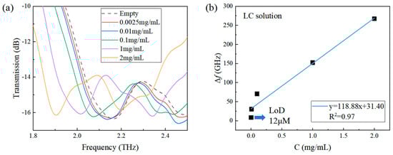 Transmission spectra of LC solutions at different concentrations are shown in Figure 7a. It can be observed that the central frequency of the resonant peak has a redshift as the concentration of the LC sample increases. To quantitatively describe the resonant frequency redshift, variation in the Δf with the concentration is shown in Figure 7b and the relation between them can be linearly well fitted with an equation of y = 118.88x + 31.40 with R2 = 0.97. Due to the spectral resolution of the spectrometer (7.6 GHz), when the LC concentration is 0.0025 mg/mL, Δf reduces to the equivalent value with the spectral resolution as shown in Figure 7b. Therefore, the limit of detection (LoD) of LC by the metamaterial sensor is determined to be 0.0025 mg/mL (~12 μM). In comparison to the recent detection result of 0.1 mM [47] for potassium citrate with the traditional THz metamaterial, the QBIC THz metamaterial has one order of magnitude improvement on the LoD. In addition, the liquid amount dropped on the sensor is only 20 μL, which is also significantly reduced compared with previous THz metamaterial detection [41], indicating that the QBIC metamaterial sensor in this work has excellent sensing performance.