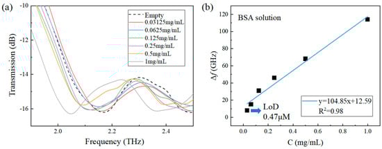 The THz transmission spectra of the BSA solutions with different concentrations were measured and the results are shown in Figure 8a. Similarly, the central frequency of the resonant peak has a redshift as the concentration of the BSA sample increases. The relation between the central resonant frequency shift and the BSA concentration can be linearly fitted with an equation of y = 104.85x + 12.59 with R2 = 0.98 as shown in Figure 8b. Similarly, considering the spectral resolution of the spectrometer, the LoD of the metamaterial sensor for BSA solutions is 0.03125 mg/mL (0.47 μM) as marked in Figure 8b. To compare this LoD with previously reported detection results of 1.52 μM by a polarization-insensitive THz sensor [48], 1 μM by a asymmetric split resonator THz sensor [47], 0.53 μM by an all-metal THz sensor [49] and 0.15 μM by a SRRs THz sensor [50], the QBIC sensor is advantageous in sensitivity for low-concentration protein detection.